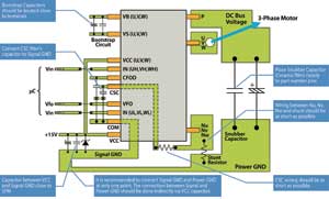 與電壓源變頻器的分立元件方案類似,采用智能功率模塊時也要注意外部元件的布局安排。圖3所示為針對Motion-SPMTM應(yīng)用的一些建議。由于電壓源變頻器的開關(guān)速率很快,信號接地和功率接地必須分開。兩種接地在15VVcc電容處互接。Vcc電容和功率接地之間的通道要狹窄,以去除耦合。為防止電涌造成破壞,引腳P與功率接地之間應(yīng)當(dāng)有一個低電感電容。另外,由于電壓源變頻器和馬達之間的長引線會造成高壓反射,因此一些SPM產(chǎn)品配備了外接?xùn)艠O電阻來調(diào)節(jié)開關(guān)速率和最大限度地減少反射。