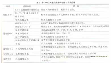 (5)上述調(diào)試試驗(yàn)如有異常,立即查找原因并排除故障PI7000矢量變頻器的故障與異常處理,可見表2