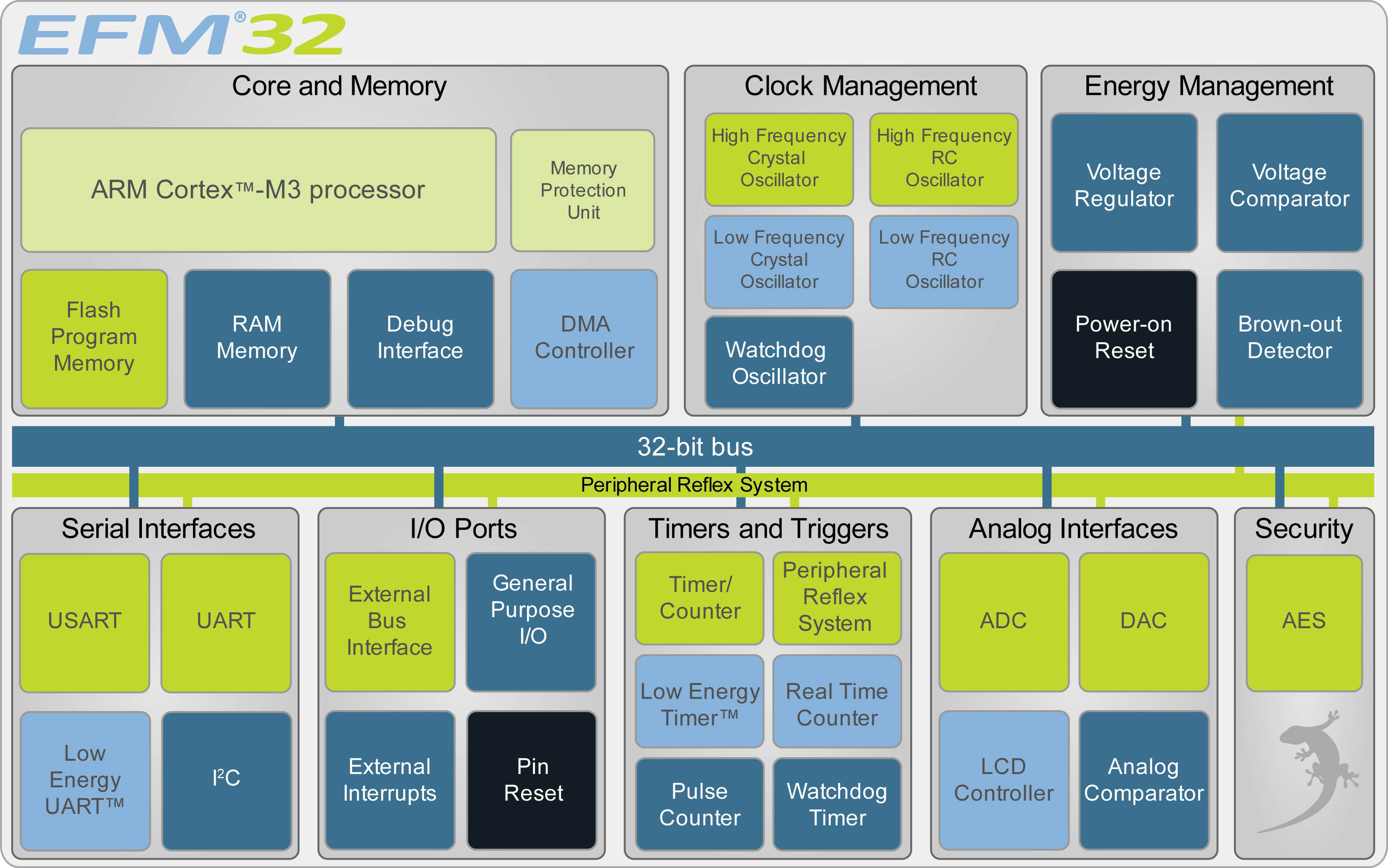 一體化是限制電源的一個重要因素。由于一整套片上外圍設備,Gecko CPU形成了一個有絕對最低的外部元件的系統基礎。其內核包括片上閃存(達128 KB)和RAM(達16 KB),有1系列的串行接口包括UART(標準和低功耗),USARTs和 I2C,其多個數字I / O達到了90個引腳;幾個不同的定時器/計數器模塊也將產生PWM輸出,而模塊包括模擬/數字和數字/模擬轉換器。其它的片上硬件不僅包括一個用來直接驅動1個4x40段顯示器的LCD控制器模塊,也包括一個為AES加密的加速功能。