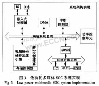 在多媒體SOC中,為了保證服務質(zhì)量,系統(tǒng)的設計目標必須是面向最高負載情況。然而在實際運行過程中,視頻解碼器、中央處理器以及一些外設經(jīng)常處于不活動或者低負載狀態(tài),這無疑白白消耗了一些能量。為解決該問題,EDA公司對Multi-Vt以及Muhi-Vdd等低功耗設計技術提供更有力的支持,IP供應商對同一IP核也提供了豐富配置以滿足不同應用需求,同時Foundry也提供了更豐富的標準單元庫以及工藝。在進行低功耗多媒體SOC設計的過程中,設計者所要做的就是充分利用這些技術優(yōu)勢,盡可能地去開發(fā)可利用的低功耗設計空間。