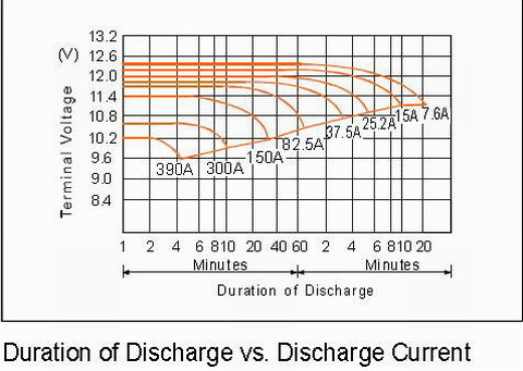 上圖是蓄電池生產廠家提供的150AH/12V蓄電池放電曲線。在實際使用時根據不同的負載電流選定不同的放電終止電壓。在該放電曲線中,以10小時放電和5小時放電曲線為例,對于10小時放電(負載電流為15A)來說,如果放電到終止電壓11V(44V),此時蓄電池放出的容量大約為100%。一般情況下,為了保護蓄電池盡量避免其深度放電,放電深度最好≤80%,終止電壓在46V左右,放電時間約為8小時。對于5小時的放電率來說(負載電流為25.2A),終止電壓10.8V(43.2V)放出100%容量,在實際使用時放電深度≤80%,終止電壓在45.6左右,放電時間為4小時。