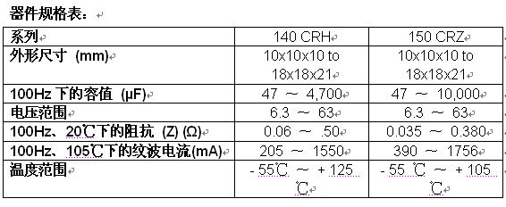新電容器提供最嚴(yán)格的回流焊曲線,具有從10mmx10mm到更大的18mmx18mm的7種外形尺寸。近日發(fā)布的140 CRH器件的高溫性能達(dá)+125℃,150 CRZ電容器具有超低的“Z”阻抗,或是在100kHz下提供0.035Ω的最大阻抗額1756mA的紋波電流。