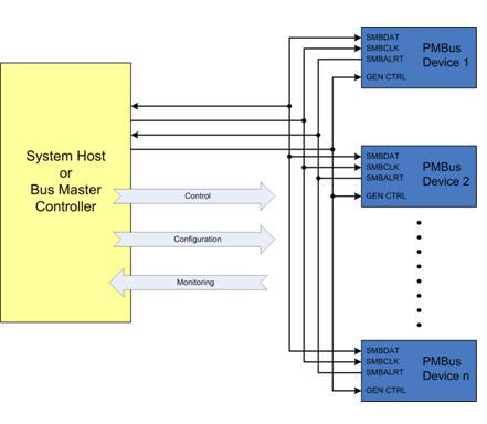 系統主機可以是安裝于印刷電路板(PCB)上作為電源管理總線裝置的實體裝置,如現場可編程門陣列(FPGA),微處理器或通用的微控制器,也可以是處于系統外部的控制實體,如自動檢驗設備,甚至可以是臺式電腦中的控制軟件。能夠用于系統管理總線通信的任何物體均可用作電源管理總線系統的界面。