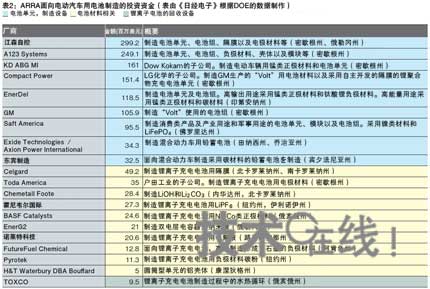 在奧巴馬政權(quán)的經(jīng)濟(jì)刺激政策“ARRA”的7872億美元中,美國(guó)能源部(DOE)將其中的14億9190萬(wàn)美元用于電動(dòng)車輛用充電電池的生產(chǎn)(表2)。利用該ARRA投資的條件是,接受投資的企業(yè)需要自行準(zhǔn)備與投資額大致相同的資金,因此共計(jì)有約30億美元的資金用于電池生產(chǎn)。