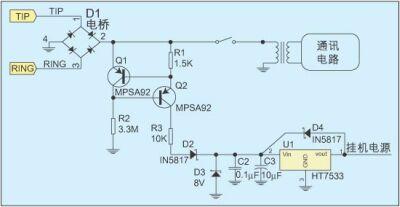 以前使用的普通電話機只需要很小功率就可滿足正常通話的要求。它們利用交換機的饋電和簡單的并聯或串聯線性穩壓電路提供的幾毫安電流,驅動通話電路工作,而不用過多關心效率與過流保護的問題。