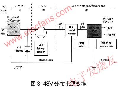 圖3示出電信應用的-48V分布電源系統框圖,該圖說明了電源從輸入ac線到低電壓dc-dcPOL變換器的過程,電池(48V)為電源失效時備份ac-dc變換器。-48V熱交換控制器(IC)在帶電插撥電路板時,為電源連接提供智能控制,這包括侵入電流控制,短路保護和保護電源系統的其他保護功能。第一個dc-dc變換級是一個隔離變換器,這意味著輸入dc電源地與輸出ac電源地是隔離的,通常采用變換器隔離,隔離是限定的,防止在失效條件下所呈現危險電壓電平危害人。然而,隔離電路使變換器比較貴并對效率有影響。為系統單元電路提供電源的POL變換器不需要隔離,因為它們由為其提供dc輸入電源的隔離電源模塊保護。