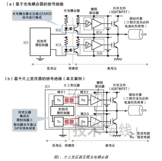在絕緣型開關(guān)電源和交流馬達(dá)的驅(qū)動電路中,PWM信號等的絕緣一直使用光電耦合器(a)。如果能夠使用片上變壓器的話,就可以集成在微控制器上,因此可以大幅削減部件個數(shù)(b)。圖是根據(jù)瑞薩電子的資料制作而成的。