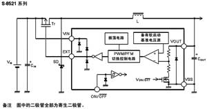 通過外接P溝道功率MOSFET或PNP晶體管、線圈、電容器和二極管,可以構成降壓型DC/DC控制器,該產(chǎn)品適用于移動設備的電源。主要指標:輸入電壓為2.5?16V,輸出電壓為1.5?6.0V,可以0.1V為進階單位來進行設定;低消耗電流工作時:60μA最大值(A、B型產(chǎn)品);休眠時:0.5μA最大值。振蕩頻率典型值為180kHz(A、B型產(chǎn)品);軟啟動功能典型值為8ms(A、B型產(chǎn)品);備有開/關控制功能。圖2為S-8251基本電路。