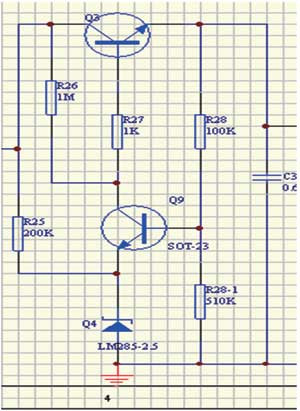 因為S-8251芯片輸入電壓范圍是2.5~16V,總線輸入電壓范圍24V,必須先經(jīng)過降壓環(huán)節(jié),這將使變換效率大打折扣。降壓電路靜態(tài)功耗要小于幾十μA量級,否則總線電流很難做到小于3.5mA。我采用MOSFET串聯(lián)降壓方式,基準源沒有采用穩(wěn)壓二極管,而是使用LM385,做到靜態(tài)電流36μA。圖3為24V降壓到16V電路。