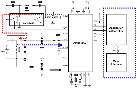 藍色箭頭表示接收路徑。變壓器從電力線耦合過來的信號經AMIS-49587內置放大器構成的低通濾波器由內部ARM進行FSK解調分析。圖中黑色箭頭是50Hz的過零檢測信號引腳。系統依靠這個信號進行同步定時。圖中藍色虛線內是電表內的應用處理器,負責應用層處理通信及計量。