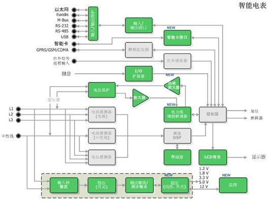 安森美半導體應用于智能電表的完整解決方案安森美半導體應用于智能電表的方案包含一系列標準產品、專用標準產品(ASSP)及專用集成電路(ASIC),可以提供智能電表的4種基本功能,包括:電源/電源管理、計量、寄存及通信,具體產品包括功率因數控制器、交流-直流(AC-DC)控制器、直流-直流(DC-DC)控制器、穩壓器,MOSFET、整流器、三端雙向可控硅開關元件(TRIAC),PLC調制解調器、線路驅動器及信號放大器,濾波、輸入/輸出(I/O)及數據保護,LCD背光驅動器,EEPROM存儲器,及智能卡接口等。圖2是由安森美半導體的多種器件(圖中綠色部分)構成的智能電表應用。