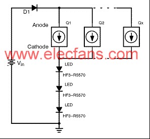圖1:并行配置30mANSI45030恒流穩壓器以提高電流能力示例