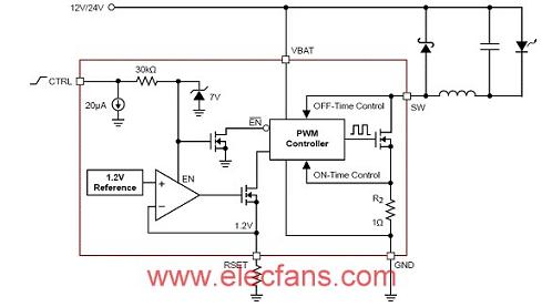 由于LED發射的光與通過LED的平均電流成正比,CCR同樣也提供調節光輸出的能力。通過模擬或數字脈寬調制(PWM)技術提供調光。模擬方法注入模擬信號至反饋電壓,從而使平均輸出電流減小。數字方法使用輸入PWM信號來抑制穩壓器的開關,并降低平均輸出電流。典型調光頻率介于200Hz與1,000Hz之間,因為人眼不能察覺頻率高于100Hz時的細微變化。