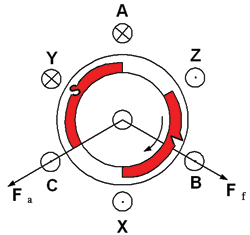 得知Hall輸出信號(hào)與轉(zhuǎn)子磁動(dòng)勢位置的關(guān)系之后,可以產(chǎn)生正六邊形的旋轉(zhuǎn)磁場,如圖4所示,AB相繞組通電,產(chǎn)生圖中合成磁勢Fa,由于Fa的牽引,F(xiàn)f將會(huì)順時(shí)針旋轉(zhuǎn),旋轉(zhuǎn)到X位置后,換成給AC相通電,則Fa順時(shí)針跳躍60°電角度,牽引Ff順時(shí)針旋轉(zhuǎn)60°,依次類推,通電順序按照AB-AC-BC-BA-CA-CB-AB循環(huán),則帶動(dòng)永磁轉(zhuǎn)子順時(shí)針旋轉(zhuǎn)。這就是傳統(tǒng)的方波控制方式。