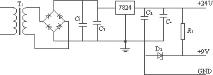 在設計中,我們沒有采用常用的DC/DC模塊作驅動電路電源,而是采用簡單而便宜的三端穩壓器件7824作驅動電路電源。通過實驗說明,它在可靠性下降不大的情況下使成本下降了3/4。一路驅動電源電路圖如圖4所示。