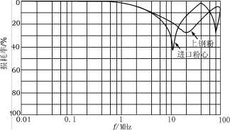 但是值得商榷的是,可選擇作為濾波器的差模電感的磁粉心不僅僅是μe=75鐵粉心一種,圖5是鐵粉心系列μe=75,μe=55,μe=35磁導(dǎo)率隨頻率變化的曲線,可見它們磁導(dǎo)率隨頻率上升而下降的趨勢不同。圖6是MICROMETARS公司-8(μe=35)和上海鋼研精密合金器材研究所SF-33(μe=37.5)鐵粉心材料的插入損耗曲線,可見吸收峰出現(xiàn)在不同的頻率范圍內(nèi),因此除了考慮電感量大小,磁飽和問題,價(jià)格等因素外,還應(yīng)該考慮抑制噪聲的頻率范圍,來選擇不同型號的鐵粉心。