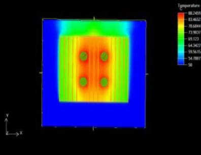 盡管散熱器的參數(shù)優(yōu)化對溫升控制略有改善,但仍不能滿足功率管的可靠性要求,因此,我們考慮強迫風冷的散熱方式。在上述計算模型的基礎上,我們在垂直方向設定流體的流速為1.5m/s , 即在散熱器底部送風,其他參數(shù)不變。我們注意到,此時系統(tǒng)給出的流態(tài)為紊流。在初始條件中作相應的調(diào)整后,最終求得的器件表面最高溫度約為89°C。散熱器底板截面溫度圖及橫向風速云圖分別見圖2、3。