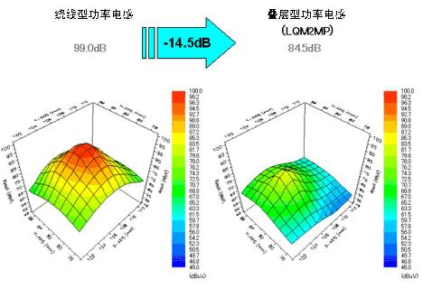 圖6顯示了繞線型功率電感和疊層型功率電感的磁束泄漏監(jiān)測(cè)數(shù)據(jù)。與一直以來作為DC-DC轉(zhuǎn)換器上使用的主要功率電感的繞線型功率電感相比,疊層型功率電感的磁束泄漏更少,現(xiàn)已證實(shí)閉合磁路的構(gòu)造使磁束泄漏較少。這些數(shù)據(jù)表明在小型高速開關(guān)DC-DC轉(zhuǎn)換器電路中使用小型疊層型功率電感的情況下,能夠發(fā)揮它抗噪特性的特長。