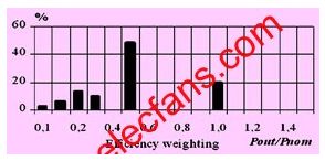 對于傳統(tǒng)電力電子裝置的設(shè)計(jì),我們通常是通過每千瓦多少錢來衡量其性價(jià)比的。但是對于光伏逆變器的設(shè)計(jì)而言,對最大功率的追求僅僅是處于第二位的,歐洲效率的最大化才是最重要的。因?yàn)閷τ诠夥孀兤鞫裕粌H最大輸出功率的增加可以轉(zhuǎn)化為經(jīng)濟(jì)效益,歐洲效率的提高同樣可以,而且更加明顯。歐洲效率的定義不同于我們通常所說的平均效率或者最高效率。它充分考慮了太陽光強(qiáng)度的變化,更加準(zhǔn)確地描述了光伏逆變器的性能。歐洲效率是由不同負(fù)載情況下的效率按照不同比重累加得到的,其中半載的效率占其最大組成部分(見圖1)。