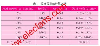 因此為了提高光伏逆變器的歐洲效率,僅僅降低額定負(fù)載時(shí)的損耗是不夠的,必須同時(shí)提高不同負(fù)載情況下的效率。歐洲效率是一個(gè)新的參數(shù),主要是針對光伏逆變器提出來的。由于太陽光在不同時(shí)間,強(qiáng)度是不一樣的,所以光伏逆變器其實(shí)并不會一直工作在額定功率下,更多的是工作在輕負(fù)載的時(shí)候。所以衡量光伏逆變器的效率,不能完全以額定功率下的效率來衡量。所以歐洲人就想出來了一個(gè)新的參數(shù)–歐洲效率來衡量。歐洲效率的計(jì)算方法如表1。