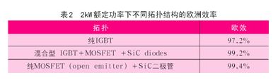 圖16所示拓?fù)浣Y(jié)構(gòu)允許純無功負(fù)載,能夠提高對電網(wǎng)的無功補(bǔ)償,也能滿足雙向功率流動(dòng),例如實(shí)現(xiàn)高效電池充電。如果應(yīng)用sic肖特基二極管,這種電路拓?fù)鋵⒖梢赃_(dá)到更高的效率等級。表2是2kw額定功率下不同拓?fù)浣Y(jié)構(gòu)的歐洲效率