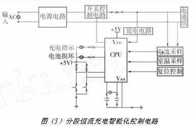 分段恒流充電智能化控制電路如圖(3)所示。該電路采用 CPU 控制,可對(duì)充電電池和充電環(huán)境溫度進(jìn)行檢測(cè),對(duì)電池充電進(jìn)行計(jì)時(shí),采用充電過程中電池的電壓和電流,對(duì)分段恒流充電過程進(jìn)行控制。