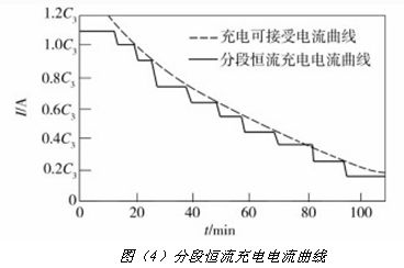 其次,分段恒流充電智能化控制技術(shù)通過減小各段恒流值下降梯度(分段數(shù)增加),可使實(shí)際充電電流曲線更接近充電可接受電流曲線。通過試驗(yàn)確定該型電池初次恒流值I(1),并減小階段恒流充電的電流下降幅度。如果降低充電電流后,達(dá)到充電終止容量梯度值的時(shí)間很短 (設(shè)定一個(gè)最小充電時(shí)間),則適當(dāng)增大電流下降的幅度。分段恒流充電電流曲線如圖(4)所示。
