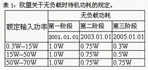 在環(huán)保意識日益受到重視的綠色時(shí)代,有效利用有限的能源已經(jīng)成為人們的共識。歐美國家對于電器產(chǎn)品在空載待機(jī)時(shí)的功耗定義了明確的規(guī)范,歐盟(EEC)公布的具體規(guī)定如表1所示,而在美國方面,從2001年7月起該國就規(guī)定政府機(jī)構(gòu)不得購買待機(jī)功耗超過1W的電器產(chǎn)品。由此可見,在不久的未來,電源轉(zhuǎn)換器低待機(jī)功耗將成為基本要求,這也是電源設(shè)計(jì)工程師必須面臨的挑戰(zhàn)。