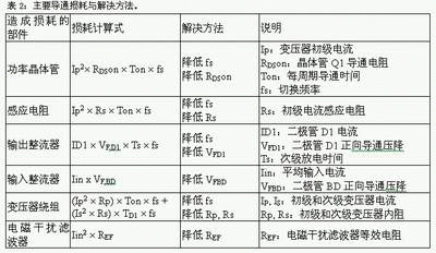 開關(guān)電源的損耗包含導(dǎo)通損耗、開關(guān)損耗以及外圍控制電路損耗,電路不同部分的損耗成因各不相同,因此抑制損耗的方法也有不同。需要用數(shù)學(xué)方程式量化這些損耗,進(jìn)而整理出降低各部分損耗的方法,才能得出具體有效降低整體損耗的方案。為了討論方便,本文以常用的回掃轉(zhuǎn)換器為例,將各部分損耗以數(shù)學(xué)方程式表示,并列出解決方法。表2、表3及表4分別為導(dǎo)通損耗、切換損耗以及外圍控制電路損耗的原因分析與解決對策。