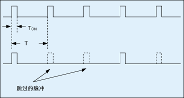 圖1為脈沖跳躍技術(shù)示意圖。當(dāng)負(fù)載降低時(shí),驅(qū)動功率開關(guān)的開關(guān)脈沖將被遮蔽(即跳過),部分脈沖被省略也即等效于降低了開關(guān)頻率,可降低高頻開關(guān)帶來的損耗,然而這種降頻方式會造成輸出電壓突降或突升(圖2)。