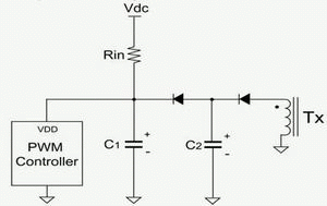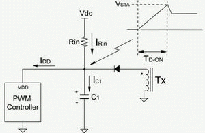 起動電路損耗在電源轉(zhuǎn)換器空載待機(jī)損耗中占很高的比例,此處我們介紹一種起動速度快且損耗低的起動電路。圖6(a)為傳統(tǒng)起動電路,其中VSTA是脈寬調(diào)制控制器起始臨界電壓,TD_ON是啟動延遲時(shí)間,TD_ON=(C1×VSTA)/IC1。使用較大輸入電阻(Rin)可以有效降低電阻損耗,但啟動延遲時(shí)間會延長。因此建議采用圖6(b)電路,其中C1電容較小,這樣在用大輸入電阻時(shí)能夠降低起動電路的損耗,同時(shí)仍然擁有較快起動速度。較大的C2電容可提供穩(wěn)定的電壓給控制器使用,不會增加起動延遲時(shí)間。