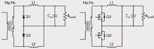 從拓撲的角度來看,同步整流器的傳導損耗和開關損耗都更低,能夠提高這些轉換級的效率,因而是開關模式電源次級端的基本構建模塊,在服務器電源或電信整流器等低壓及大電流應用中非常流行。如圖1所示,它取代了肖特基整流器,可使電壓降變得更小。從器件角度來看,過去十年中,功率MOSFET晶體管的進展巨大,催生出了新穎的拓撲和高功率密度電源。20世紀早期平面技術問世之后,中低電壓MOSFET迅速被開發出來,利用溝槽柵技術來大幅提高性能。溝槽柵MOSFET是中低電壓電源應用的首選功率器件,其把一個柵極結構嵌入到精心蝕刻在器件結構上的溝槽區域中。這種新技術可以提高溝槽密度,并無需JFET阻抗元件,因此能夠使特征導通阻抗降低30%左右。當MOSFET的導通阻抗與漏極電流的乘積小于二極管正向電壓降時,同步整流的能量損耗降低。