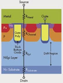 這種方案不僅有助于減小柵-漏疊加電容CGD,還能改善漂移區阻抗。此外,它也有利于降低導通阻抗與柵極電荷,因為現在可以一方面通過薄柵極氧化層來獲得更低的Vth與導通阻抗,同時又還可以在溝槽底部采用加厚氧化層以獲得最低的CGD。還有一種技術就是采用電荷平衡或超級結器件結構。它最初是針對高壓器件開發的,現在也可用于低壓器件。利用電荷平衡方案,可以在漂移區獲得兩維電荷耦合,因而能夠在漂移區采用更高的摻雜濃度,最終降低漂移阻抗。相比前代技術,這種新型中壓功率MOSFET不僅在特征阻抗方面有大幅度改進,同時其原本相當出色的開關特性也得到進一步提高。