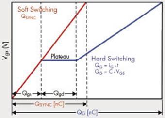 利用已知的電阻值,可通過下式求得QSYNC,這樣就可以更準確地估算出柵極驅動功耗。同步整流中,QSYNC較小,器件的性能也較好。如圖7所示,同步整流的功率MOSFFET的柵-源電壓上無平坦區。