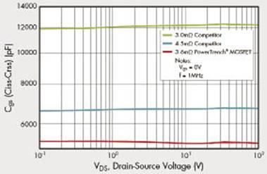 圖8 100V柵-源電容/3.6毫歐PowerTrench MOSFET與競爭產品的比較