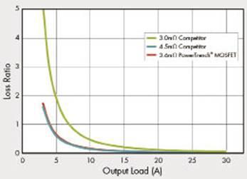 在同步整流中,要降低QSYNC,CGS(Ciss-Crss)是更加關鍵的因數。如圖8所示,由于設計優化,相比4.5毫歐的競爭產品,3.6毫歐PowerTrench MOSFET的CGS大幅度減小。如表1所示,相比4.5毫歐和3.0毫歐的競爭器件,3.6毫歐PowerTrench MOSFET的QSYNC分別降低了22%和59%。圖9對柵極驅動電壓為10V,開關頻率為100kHz的27V同步整流級的驅動損耗和傳導損耗之比進行了計算和比較。這里有兩個同步開關,在10%的負載條件下,3.0毫歐競爭產品的驅動損耗是傳導損耗的兩倍。
