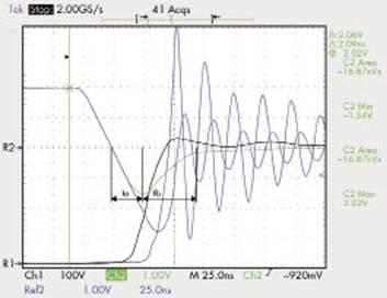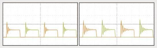 把有害電壓尖刺降至最小的一般原則是采用短而厚的電路板以及最小的電流回路。然而,由于尺寸和成本的限制,做到這些并不容易。有時,設計人員必需考慮到機械結構的問題,如散熱器和風扇;有時鑒于成本限制因素,不得不使用單面印制電路板。緩沖電路可作為一種可行的替代方案,用來在最大額定漏源電壓范圍內管理電壓尖刺。這種情況下,額外的功耗是無法避免的。此外,輕載下緩沖電路本身產生的功耗也不可忽視。除了電路板參數之外,器件的特性也對電壓尖刺電平有影響。在同步整流中,一個主要的器件相關參數是反向恢復期間的體二極管軟度因子(softness)?;旧?,二極管的反向恢復特性是由設計決定的。有好幾個控制輸入對反向恢復產生影響,如結溫、di/dt和正向電流水平。但是,當條件固定時,二極管總是表現出相同的行為。因此,器件的評估結果對評測系統的運作情況非常有用。圖10所示為兩個不同器件(但有極其相似的額定值)的反向恢復波形。