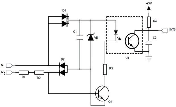當u 1 >u 2 時,穩壓管兩端電壓為5V,電容C1充電,由于C1容值較小。而u 1>u 2 的時間為半個周期,即0.01s,足以保證電容C1充電完成,此時并聯在三極管Q1基射極兩端的的二極管提供鉗位電壓,使得三極管工作在截止區,光耦U1的控制二極管不導通,受控三極管截止,單片機外部INT0拉至高電平,當經過a點后,u 2>u 1 ,U2為三極管Q1提供基極電壓,同時電容C1提供集射極電壓,三極管Q1導通,在這段時間內,C1、控制二極管、R3、Q1形成回路,光耦U1中的受控三極管導通,單片機外部中斷INT0下拉至低電平,在這個過程中,單片機對這個下降沿進行捕捉,實現對u1、u2兩相交點a進行檢測,光耦U1實現了輸入端和輸出端的電氣隔離,同時提高了系統的抗干擾能力。
