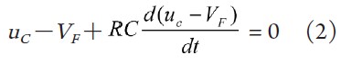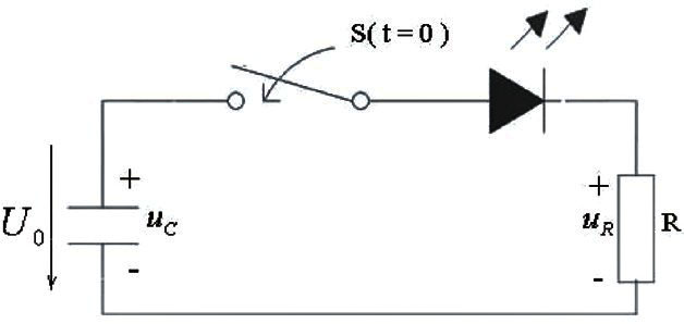 u0為穩壓二極管VD的穩定電壓,發光二極管的導通壓降為VF ,t ≥0時電容儲存的能量通過發光二極管和電阻釋放出來,在這段時間內發光二極管發光,根據KVL可得: