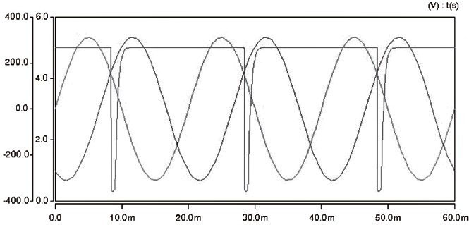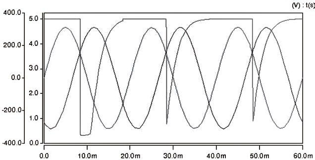 以上設計方案在Sabe r環境下進行了仿真驗證,仿真結果如圖5所示,其中兩正弦波為三相電源的其中兩相電壓,脈沖電壓為送至單片機外部中斷INT0的信號。從圖5可以清晰的看到,在自然換相點附近,產生了一組幅值為5V,脈寬約為2ms,頻率為50Hz的脈沖信號,而在自然換相點處,產生了一個近乎90度的下降沿,有利于單片機進行捕捉。改變時間常數τ可以改變脈沖電壓的脈寬,如圖5所示,在自然換相點處產生了一組幅值為5V,脈寬約為10mS,頻率為50Hz的脈沖信號。 圖5 為經檢測電路得到的脈沖電壓,圖6為不同τ值檢測電路得到的脈沖電壓。