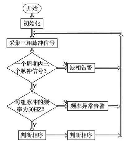 檢測電路得到的脈沖電壓信號送至Atmega16單片機進行處理,單片機的程序通過C 語言編制, 主程序流程如圖7 所示, 主要分為三個模塊: 缺相判定, 頻率正常判定和相序判定, 系統正常工作后,三個模塊循環執行。