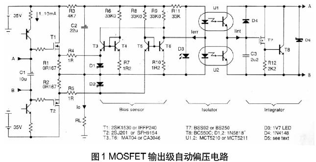 如果仔細地挑選輸出器件,特別是互補對的跨導和輸出電導,電路能取得預期的結果,例如,東芝出品的專用于線性應用的互補對:2SK1530和2SJ201。N溝道和P溝道的跨導極其匹配(在5%以內),又有較高的Early電壓(大于300V)使用的效果很好。此外,由于該電路是針對于偏置電路的,不會影響放大器的其它部分,因此可結合其它設計技術一起使用。