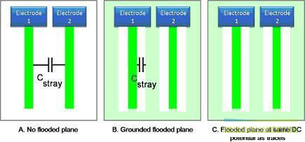 圖3. 雜散電容的路徑,顯示了下列并行走線的結(jié)果:無灌銅層的并行走線(A)、接地灌銅層上的并行走線(B),以及與走線具有相同直流電位的灌銅層上的并行走線(C)。