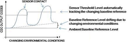 保持可靠性能。容性傳感器電極是采用PCB上的標準銅材料或柔性材料制成的。這種材料的特性會隨溫度和濕度的變化而發(fā)生改變。這種變化會使基線電平發(fā)生偏移(所有傳感器閾值電平均是以基線電平為參考的)。較大的基線偏移增加了接觸閾值電平過低或過高的風險(過低還是過高取決于基線偏移的方向)這會引起虛假的接觸誤差,或使閾值電平不是太靈敏就是不夠靈敏,導致接觸狀態(tài)的不穩(wěn)定。為保持傳感器原始的信號接觸閾值檢測電平余量(靈敏度),CDC需要自動跟蹤基線偏移誤差的幅度,并對閾值設(shè)置進行相應的重新調(diào)整。圖2中的示例介紹了AD7147和AD7148的閾值電平如何針對因環(huán)境條件變化引起的基線失調(diào)變化進行自動跟蹤和調(diào)整。