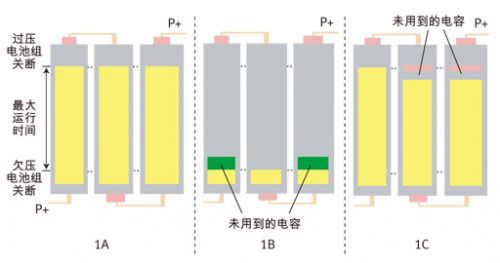 在鋰離子電池組中,存在一些允許每節串聯電池達到的預定義電壓最小值和最大值。這是一種由電池組中IC控制的安全特性,請參見圖1A。只要每一節電池均保持在過壓和欠壓斷開范圍之間,則該電池組便能夠放電和充電。如果一節電池達到上述任何一個閾值,則整個電池組便會關閉(欠壓),從而讓主機本應可用的電池組處于無法充電狀態(請參見圖1B)。另外,它不允許充電器向電池組充入應有的大量能量(請參見圖1C)(過壓)。