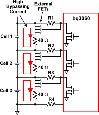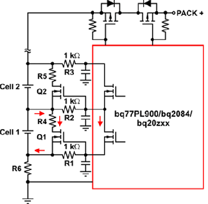 由于使用集成FET解決方案的無源電池平衡技術的平衡能力有限,因此電池差異或失衡率可能超過電池平衡。另外,由于存在低旁路電流,它可能會占用幾個周期來對一般失衡進行校正。利用現有組件設計一些外部旁路電路可以增強電池平衡(請參見圖6和圖7)。在圖6中,當決定對某節電池進行平衡時內部平衡MOSFET首先開啟。這便形成一條低電流通路,其通過連接電池端(電池1和電池2)及IC引腳的外部濾波器電阻。當內部FET柵-源電壓在電阻中形成,該外部MOSFET便被開啟。其缺點是,鄰近電池無法快速、同時獲得平衡。例如,如果鄰近內部FET被開啟,則Q2不能被開啟,因為沒有通過R2的電流。