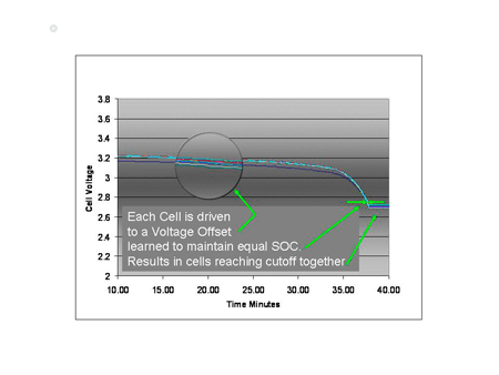 SOC抽取以一種同阻抗追蹤器件類似的方式工作,它計算出每一節電池的精確電荷電平,并在電池之間轉移能量,這樣電池電量在充電結束時(EOC)就實現了平衡(請參見圖9*)。觀察放電OCV圖(見圖10*),我們將每一節電池預平衡到一個反映其電量的失調電壓。幾個百分點的電量差異會使該放電曲線中下方出現巨大差異。如果我們已知1%到2%的電量,我們便可以在放電結束時擁有極為接近的匹配性。這就是在充電完成和放電結束時,你想要利用有源平衡技術有效地讓電池獲得最佳平衡的區域。