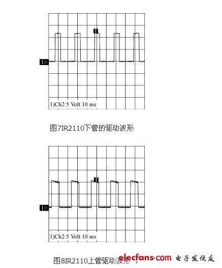 調試過程遇到的一個較為重要的問題是關于IR2110的自舉電容的選擇。IR2110的上管驅動是采用外部自舉電容上電,這就使得驅動電源的路數大大減少,但同時也對VB和VC之間的自舉電容的選擇也有一定的要求。經過試驗后,最終采用1μF的電解電容,可以有效地滿足自舉電壓的要求。