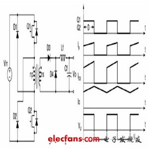 雙管正激變換器的原理圖與波形如圖1所示。雙管正激變換器的工作可以分為三個過程:能量轉移階段、變壓器磁復位階段和死區階段。在能量轉移階段,原邊的兩個開關都導通,能量從輸入端向輸出端轉移。在變壓器磁復位階段,原邊的兩個二極管都導通,使變壓器繞組承受反相輸入電壓,從而實現變壓器磁復位。當變壓器完全復位后,變換器工作在死區階段,即原邊無電流、副邊續流。在復位過程中,雙管正激開關MOSFET被箝位在輸入電壓。MOSFET上的電壓應力小于單管正激,至少低一倍。這樣我們可選取具有低導通電阻Rdson的低電壓MOSFET,以獲得低損耗。