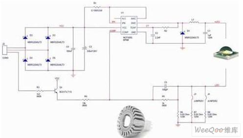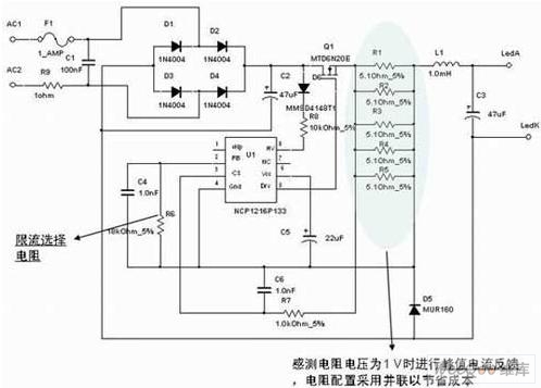 另一方面,如上所述,在不需要隔離的應用中,可以采用較為簡單的降壓拓撲結構,這種結構所使用的電感比變壓器小得多,而且只需要很少的元件來實現這種解決方案。這種架構采用的是峰值電流控制(PCC)模式,工作在深度連續導電模式(CCM)。這種架構具有多種優勢,如可以消除使用大電解輸出電容、具有“良好”穩流的簡單控制原理,以及能夠充分利用安森美半導體的動態自供電(DSS)技術能力來直接從交流線路為驅動器供電。圖3顯示的是安森美半導體NCP1216 PWM電流模式控制器的應用設計示意圖。
